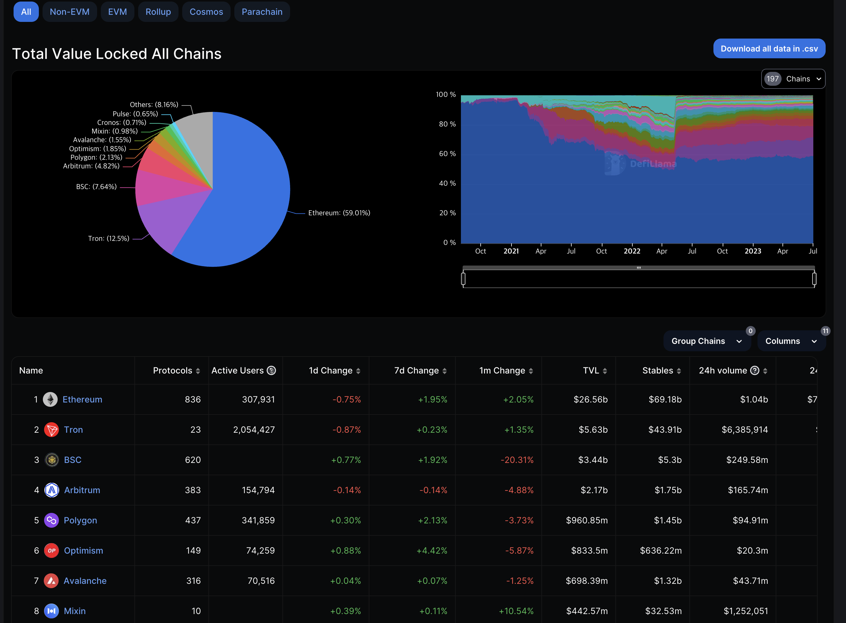 다양한 블록체인에서의 DeFi 활동도 DeFiLlama에서 확인할 수 있습니다. Ethereum, Binance Smart Chain, Solana 등 다양한 체인에서 활동하는 프로젝트의 데이터를 제공합니다.