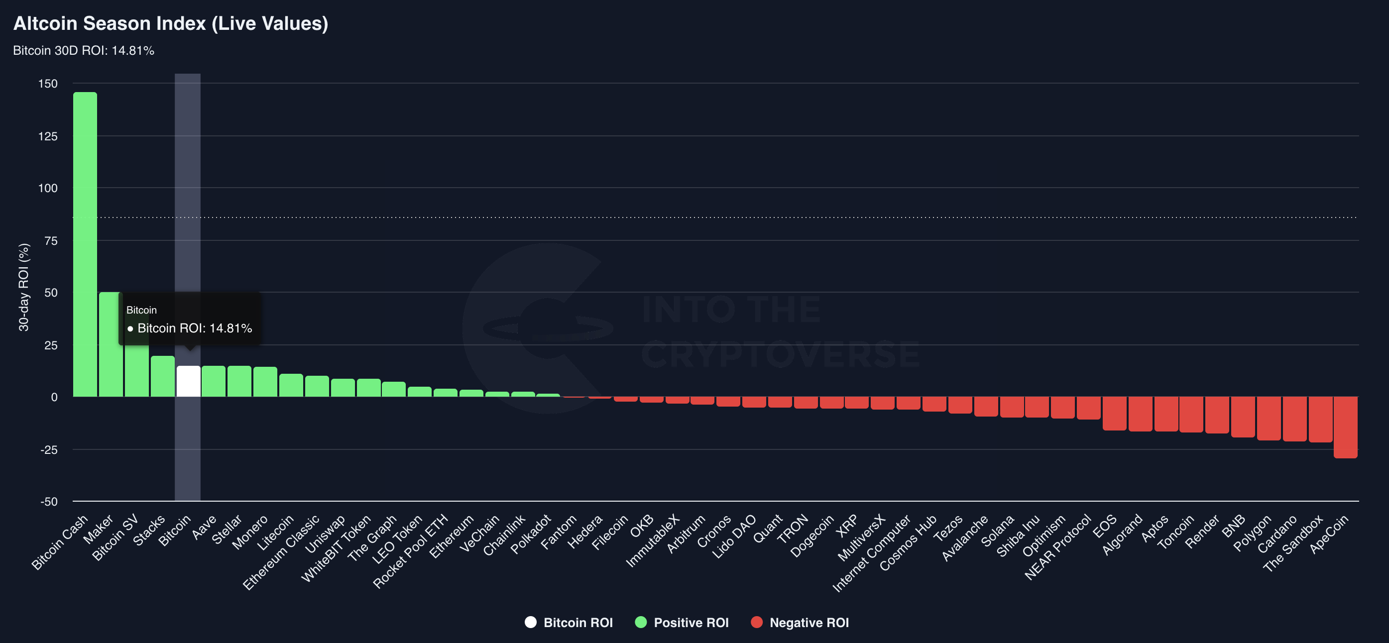 비트코인 보다 ROI 가 좋은 알트코인은 4개 , 안 좋은 알트코인은 45개