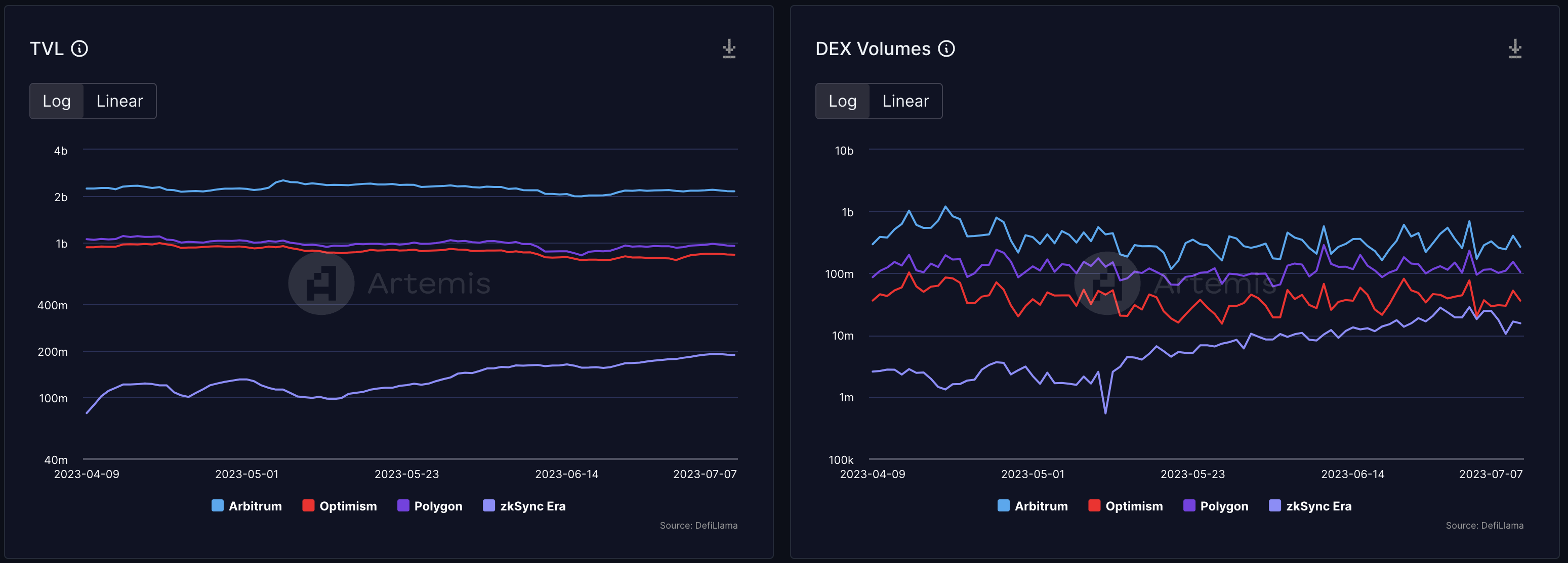 zkSync는 TVL에서 상당한 성장을 이루었지만 여전히 Arbitrum을 따라잡으려면 갈 길이 멉니다.