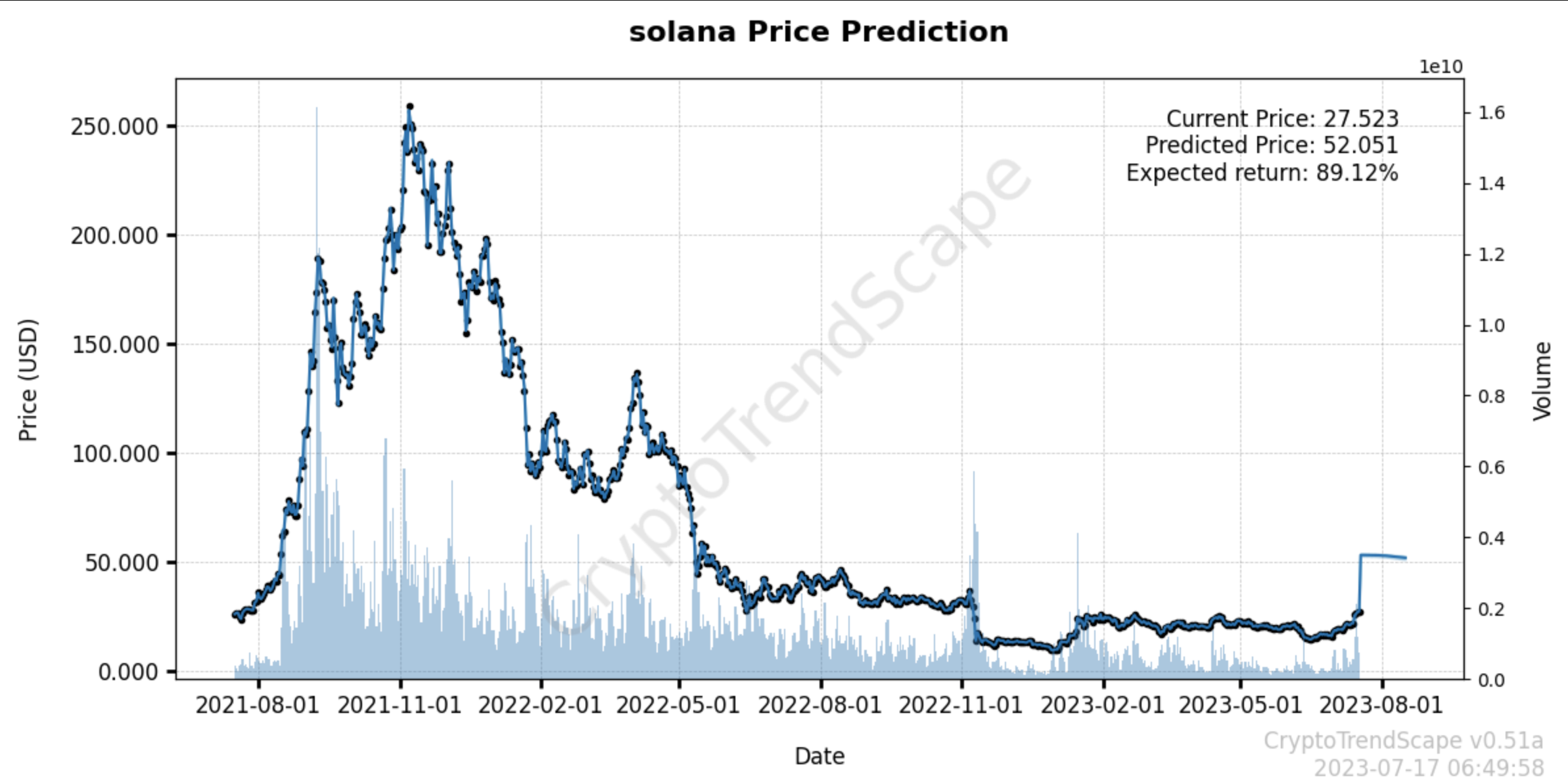 "CryptoTrendscape utilizes machine learning to conduct time-series analysis using our proprietary algorithm, based on the past two years of data. As a result, it generates a model that predicts the prices for the following month."