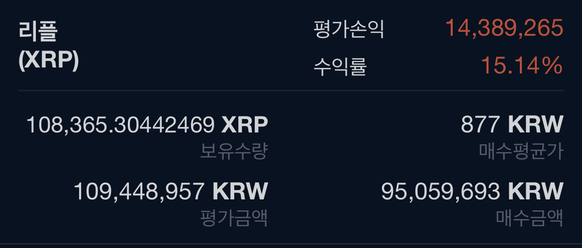 수익률은 극적으로 마이너스에서 플러스로 양전에 성공하였고, 제가 가지고 있던 리플 투자 물량과 매수 단가에 변화가 있었습니다.