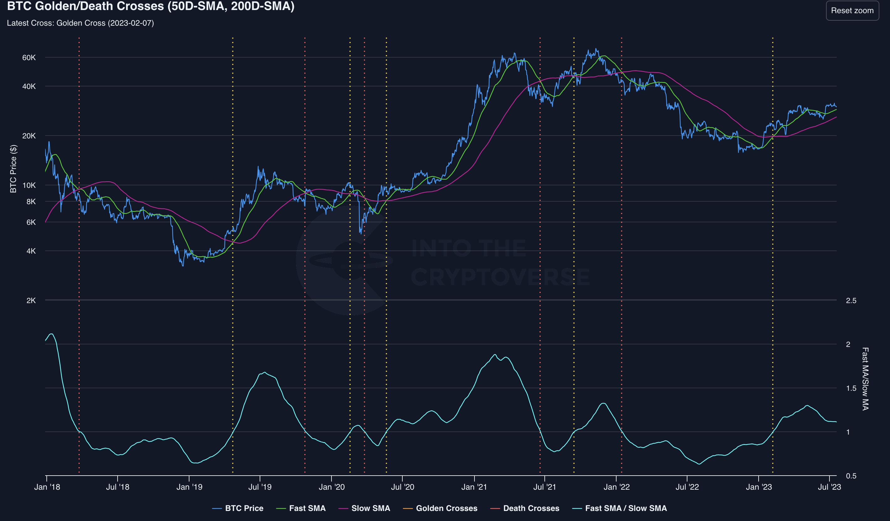 골든 크로스는 종종 강세장과 강세장의 필요조건(충분조건은 아님)으로 생각됩니다. 마찬가지로 데드 크로스는 종종 약세장에 도달하기 위한 필요조건(충분조건은 아님)으로 생각됩니다. 비트코인과 이더리움 모두 (EMA, 50, 200) 및 (EMA, 100, 200) 차트에서 이 패턴을 명확하게 보여주었습니다. 여기서 골든 크로스는 장기 강세장 직전에 발생했고 죽음의 십자가는 장기적인 가격 폭락 전에 발생했습니다.