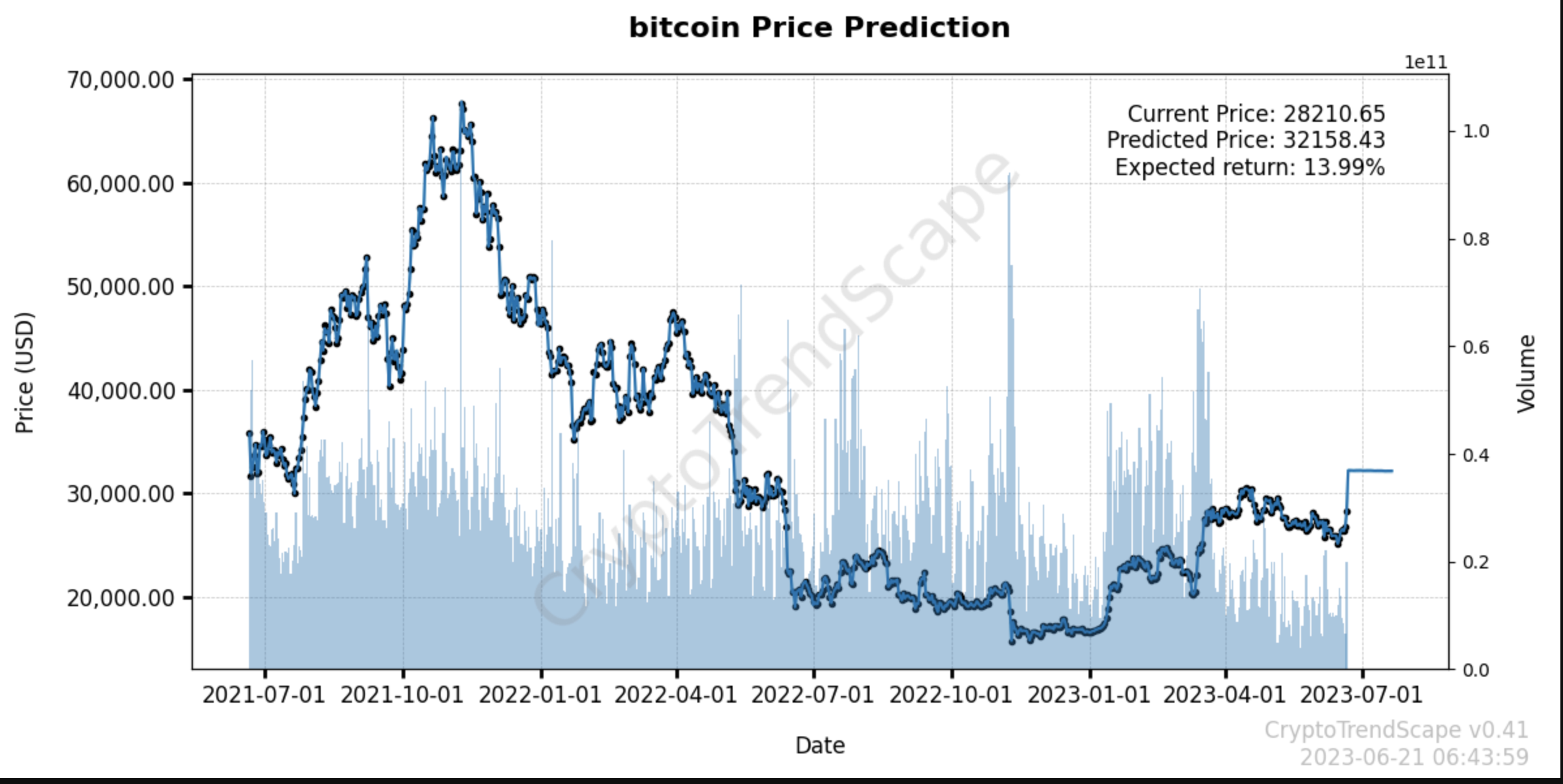 "CryptoTrendscape utilizes machine learning to conduct time-series analysis using our proprietary algorithm, based on the past two years of data. As a result, it generates a model that predicts the prices for the following month."