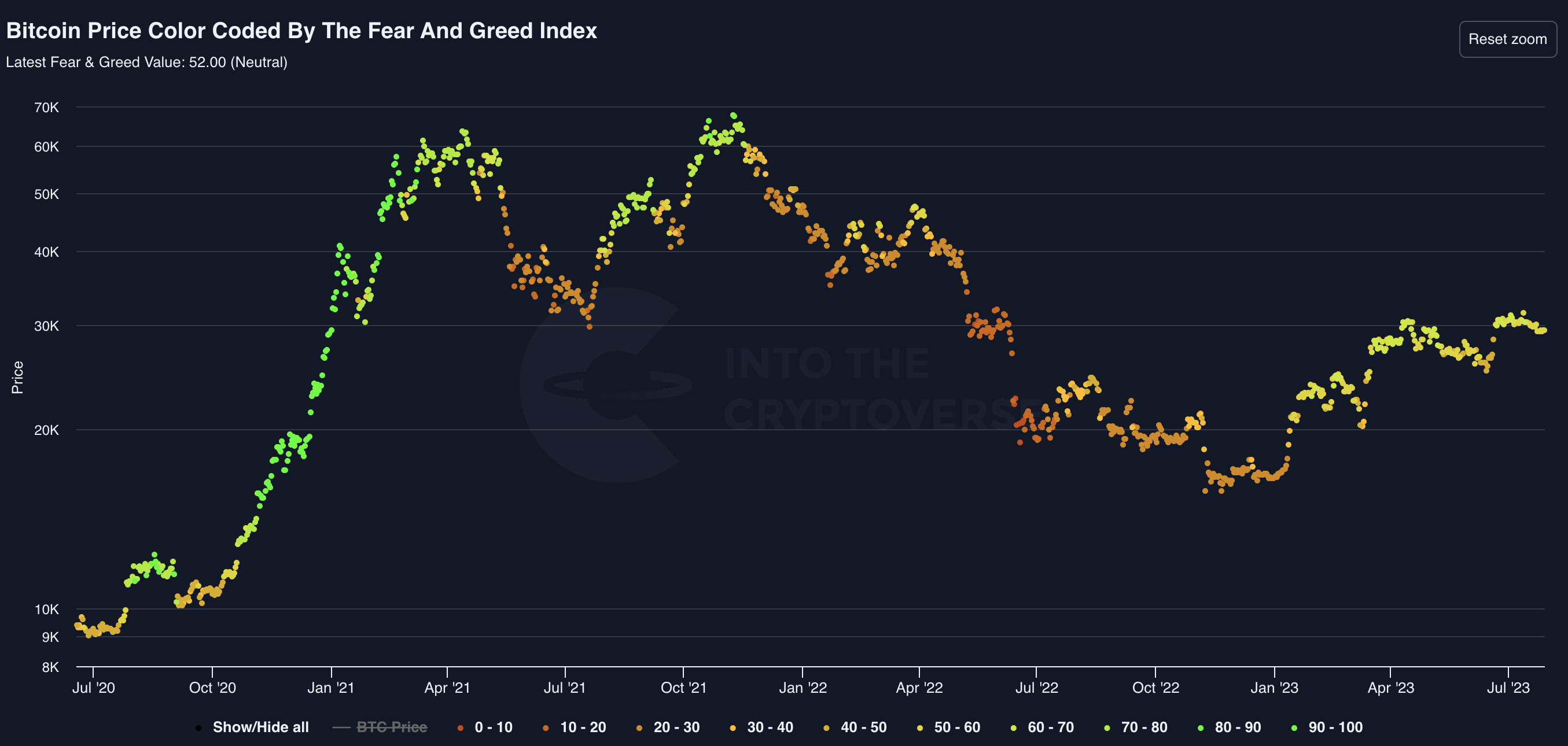 This chart shows the Bitcoin price over time color coded by the Fear & Greed Index. The Fear & Greed Index analyzes emotions as well as the Bitcoin market sentiment and crunches those numbers into a simple meter from 0 to 100. 0 means "Extreme Fear", while 100 means "Extreme Greed". The different factors that are included in calculating the Index are: Volatility (25%), Market Momentum/Volume (25%), Social Media (15%), Surveys (15%) (currently paused), Dominance (10%), Google Trends (10%)