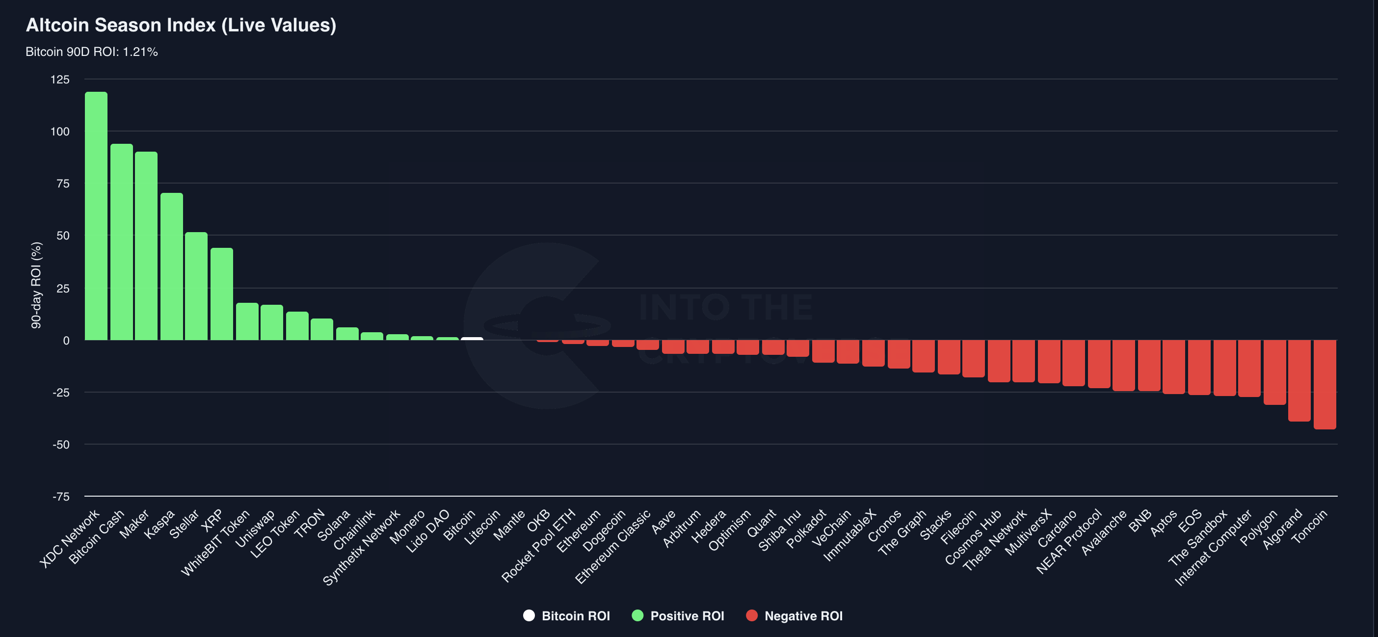Altcoin Season Index는 비트코인보다 90일 투자 수익률(ROI)이 더 높은 상위 50개 알트코인의 양을 지수에 사용된 알트코인의 양(이 경우 50)으로 나눈 다음 알트코인의 25% 미만이 BTC보다 90일 ROI가 높을 때마다 비트코인이 대부분의 알트코인을 능가하기 때문에 '비트코인 시즌'이라고 합니다. 마찬가지로 알트코인의 75% 이상이 비트코인보다 90일 ROI가 더 큰 경우 대부분의 알트코인이 비트코인을 능가하며 이를 '알트시즌'이라고 합니다. 역사적 차트의 경우, 많은 알트코인이 시작 날짜를 훨씬 거슬러 올라가지 않습니다. 따라서 상위 50개의 코인이 포함되어야 한다는 요구 사항은 시간을 거슬러 올라갈수록 약간 완화됩니다.
