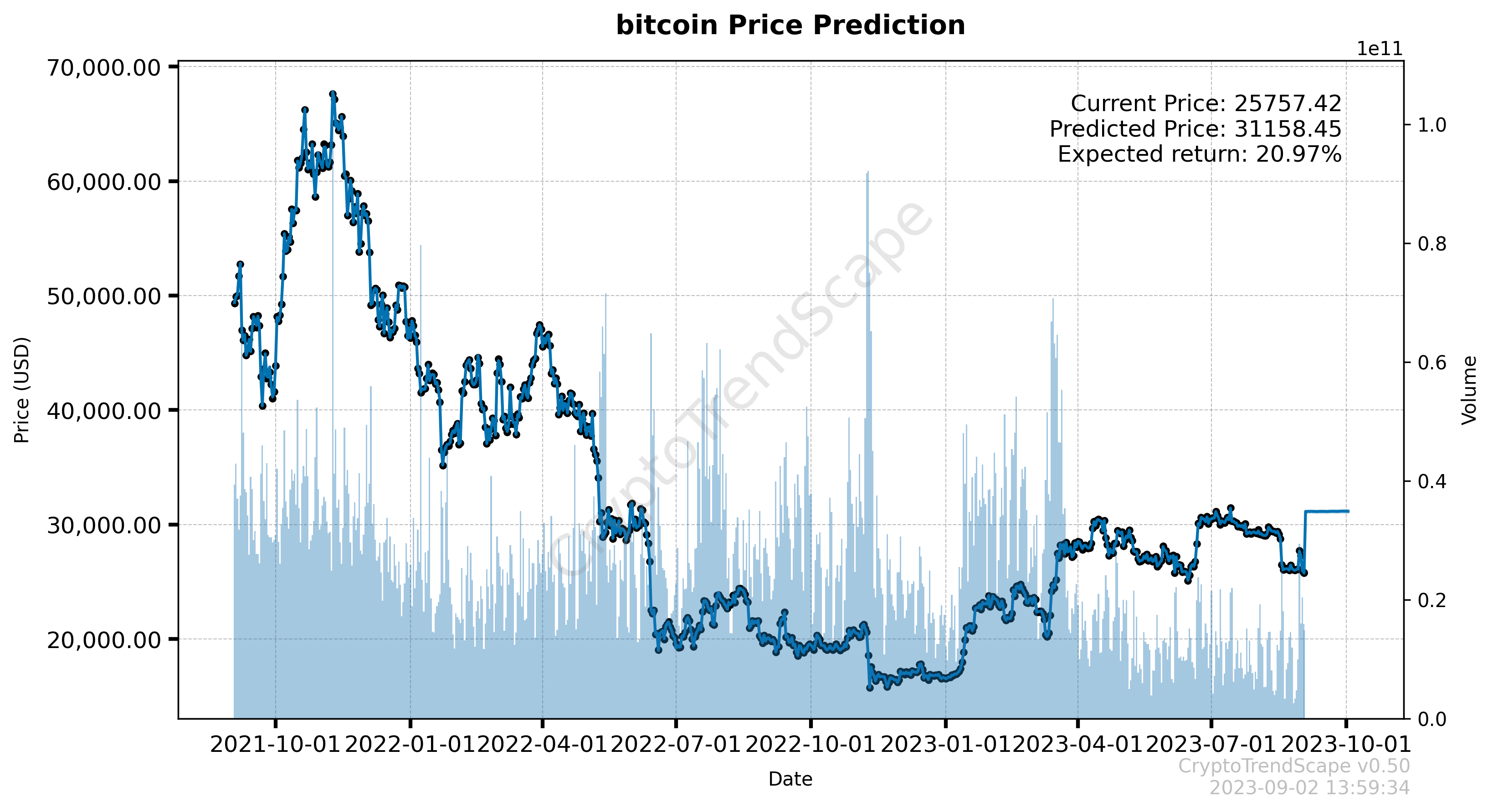 "CryptoTrendscape utilizes machine learning to conduct time-series analysis using our proprietary algorithm, based on the past two years of data. As a result, it generates a model that predicts the prices for the following month."