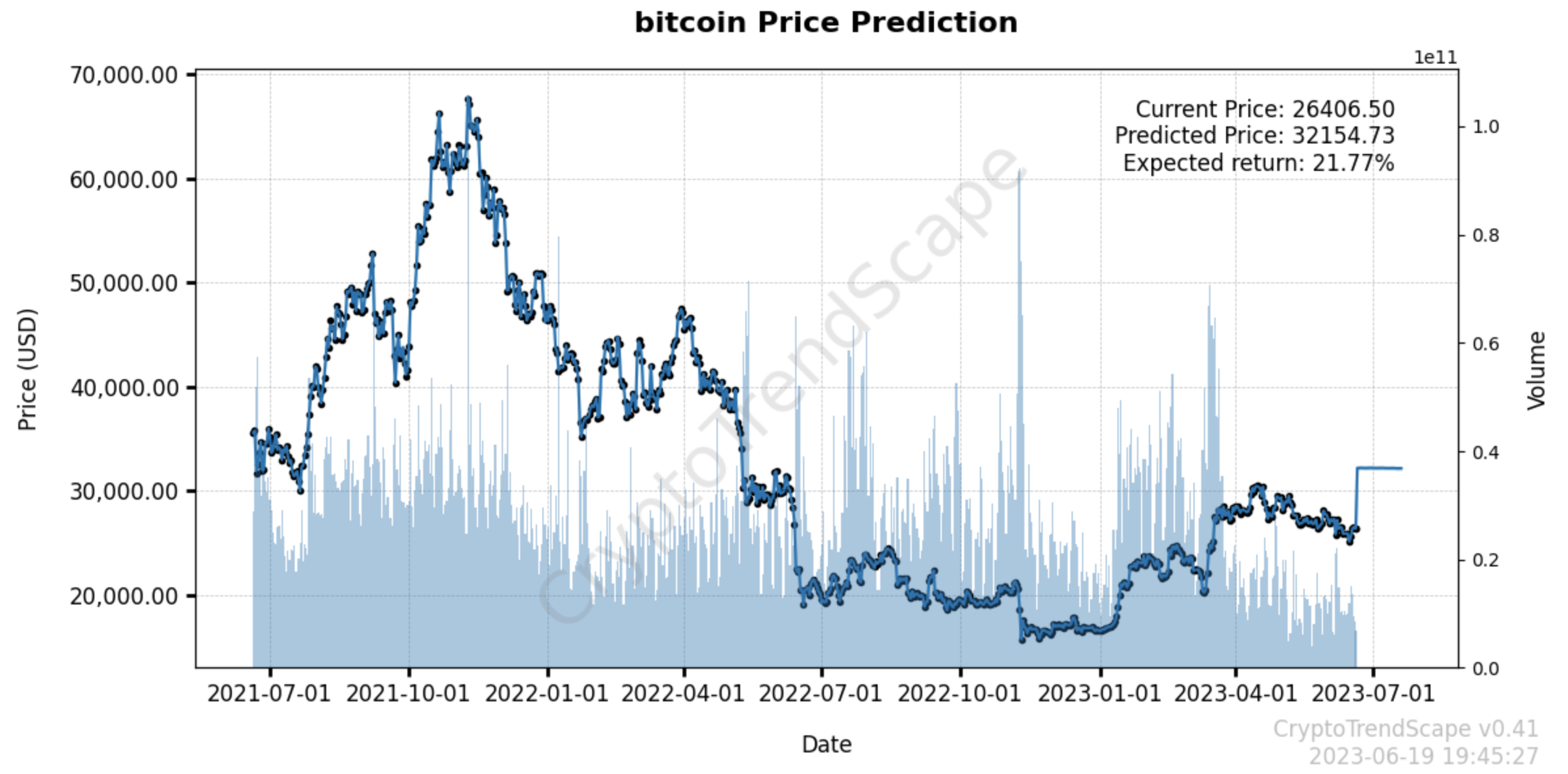 "CryptoTrendscape utilizes machine learning to conduct time-series analysis using our proprietary algorithm, based on the past two years of data. As a result, it generates a model that predicts the prices for the following month."