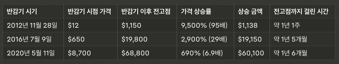 - 과거 반감기 이후 전고점까지 걸린 시간은 약 1년 1주, 1년 5개월, 1년 6개월로 점차 늘어나는 추세를 보였습니다.