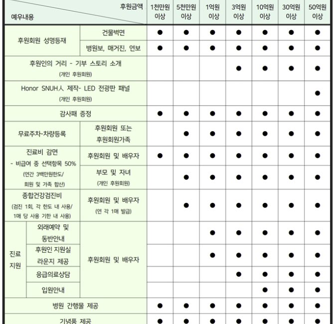 더 많은 정보가 필요하시면 각 병원의 발전기금 후원자 예우 페이지를 참고하시기 바랍니다.