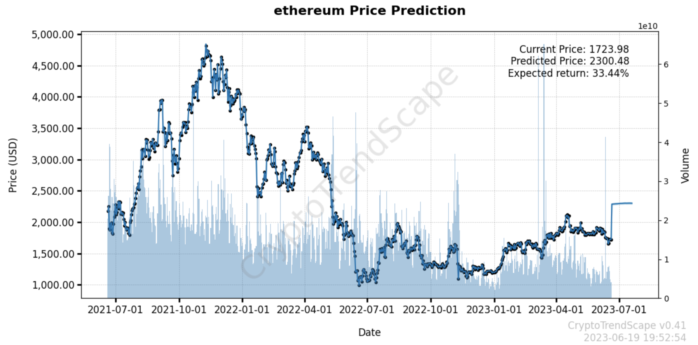 "CryptoTrendscape utilizes machine learning to conduct time-series analysis using our proprietary algorithm, based on the past two years of data. As a result, it generates a model that predicts the prices for the following month.