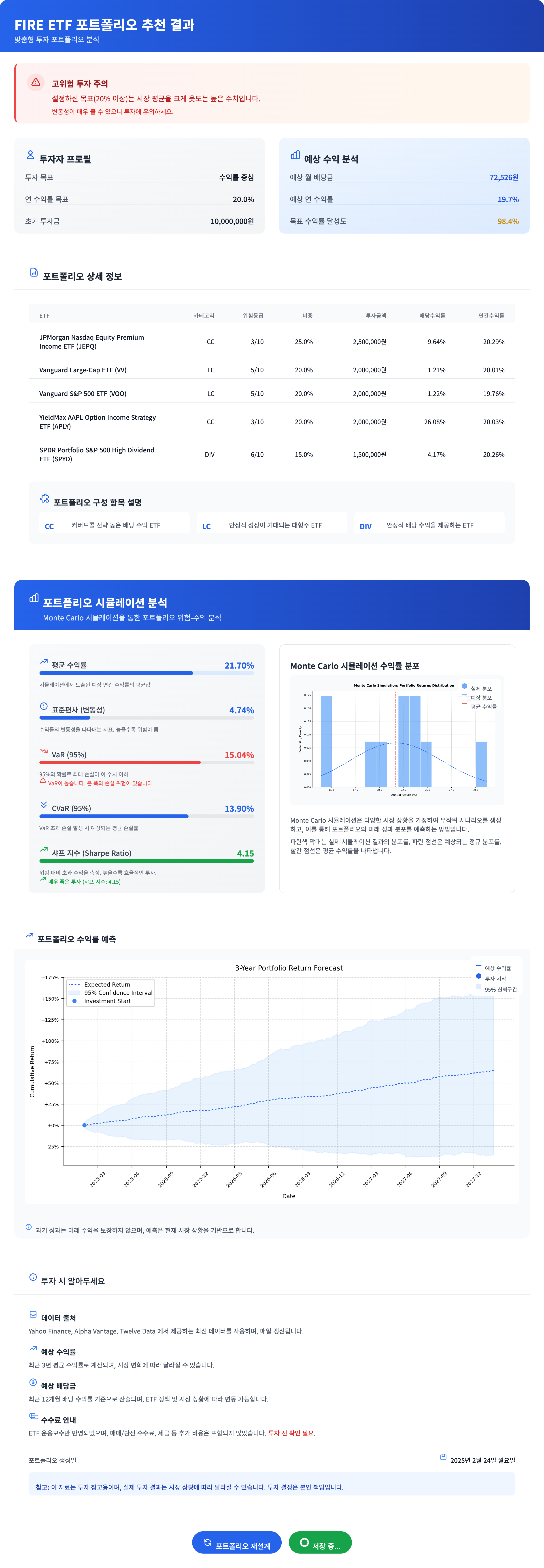 - 몬테카를로 시나리오 분석까지 지원하여 목표 수익률 달성 가능성 확인