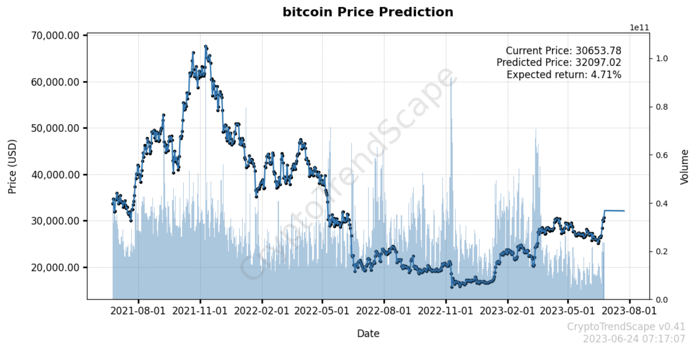 "CryptoTrendscape utilizes machine learning to conduct time-series analysis using our proprietary algorithm, based on the past two years of data. As a result, it generates a model that predicts the prices for the following month."