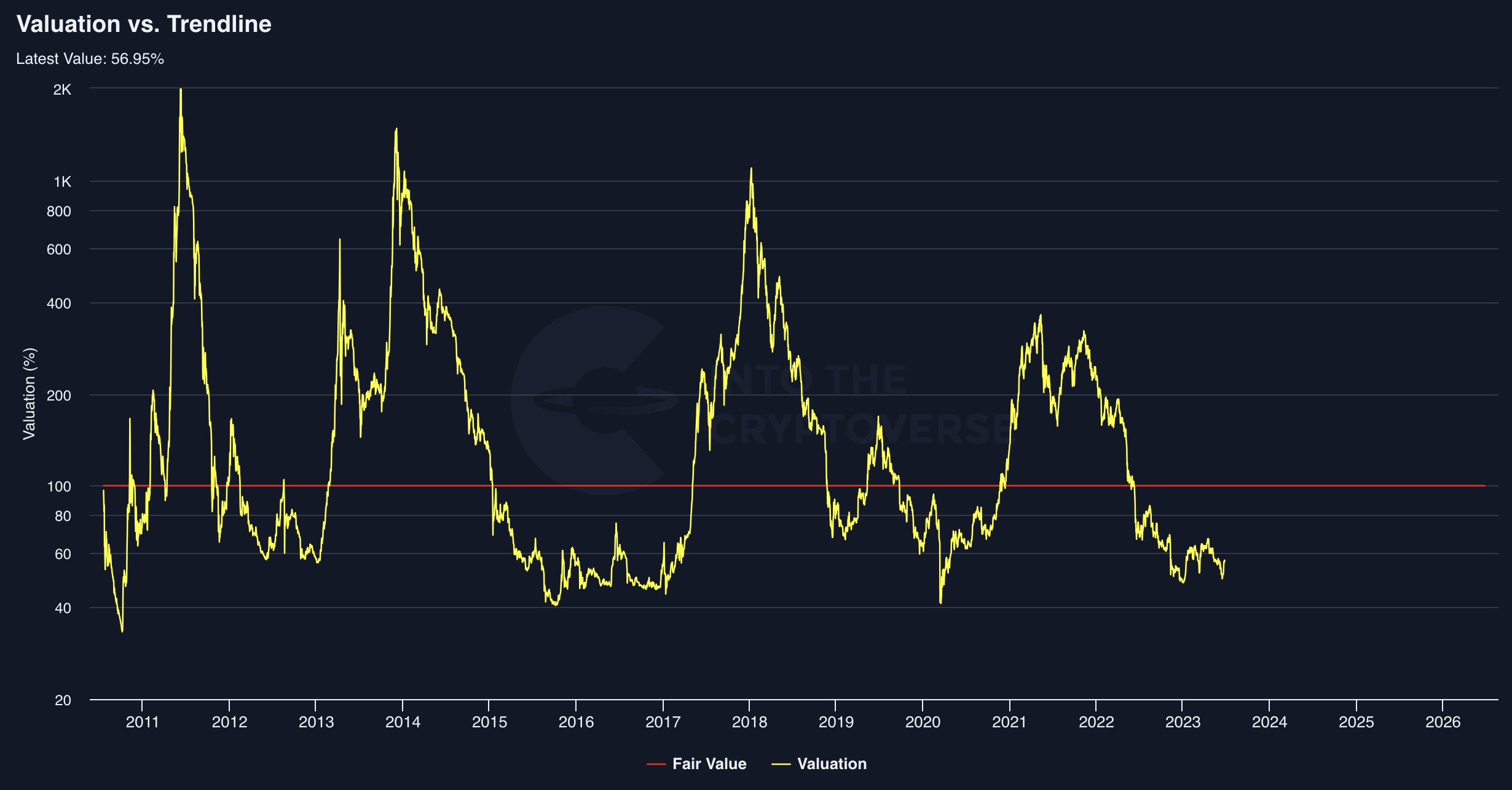 이 차트는 총 암호화폐 시가 총액의 공정 가치 대수 회귀선과의 백분율 차이를 보여줍니다(이전 차트 참조). 공정 가치 로그 회귀선은 100%로 설정되었습니다. 따라서 공정가치 회귀선에서 42% 상향 차이는 이 차트에서 142% 값에 해당합니다.