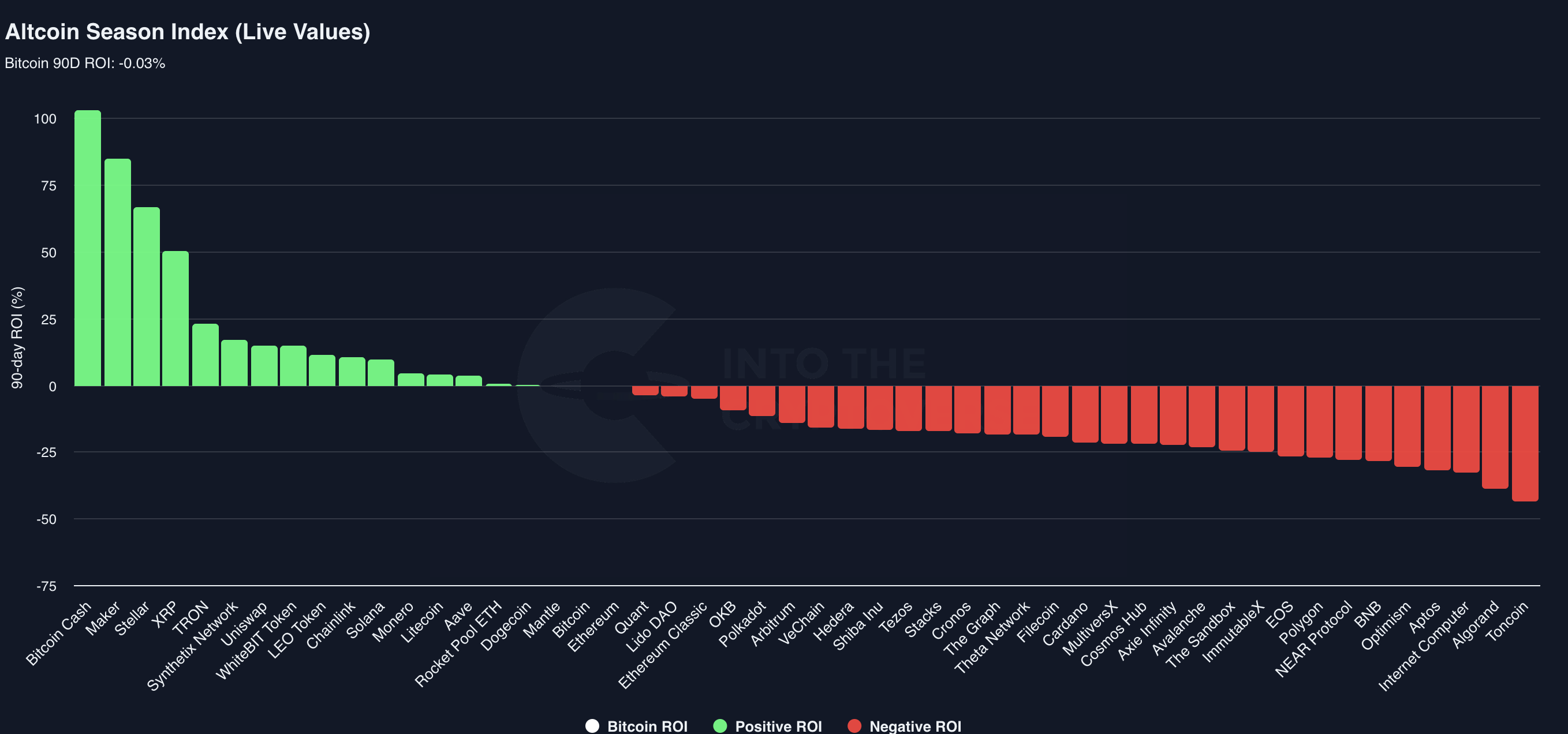 Description Altcoin Season Index는 비트코인보다 90일 투자 수익률(ROI)이 더 높은 상위 50개 알트코인의 양을 지수에 사용된 알트코인의 양(이 경우 50)으로 나눈 다음 알트코인의 25% 미만이 BTC보다 90일 RO