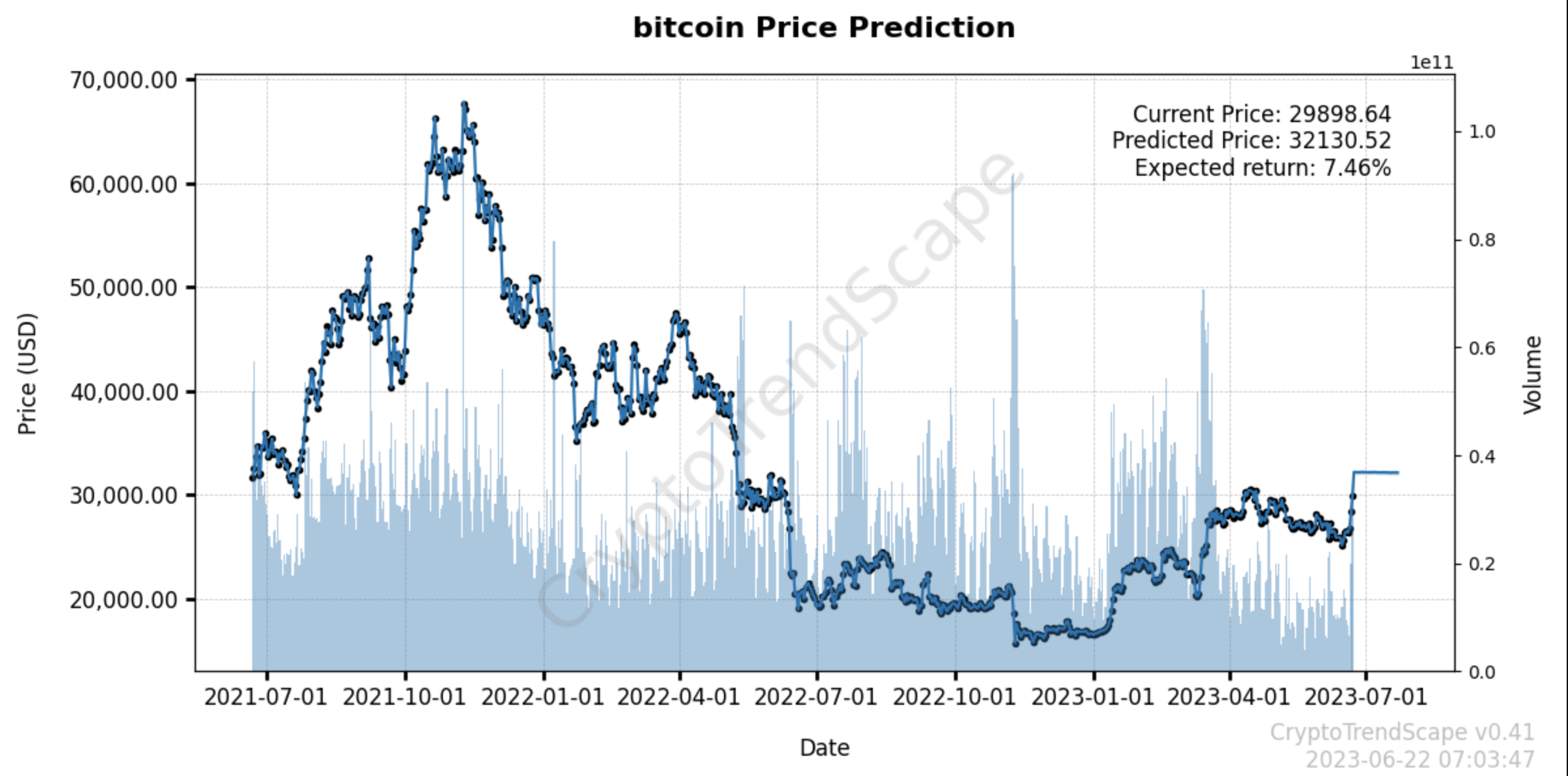 "CryptoTrendscape utilizes machine learning to conduct time-series analysis using our proprietary algorithm, based on the past two years of data. As a result, it generates a model that predicts the prices for the following month."